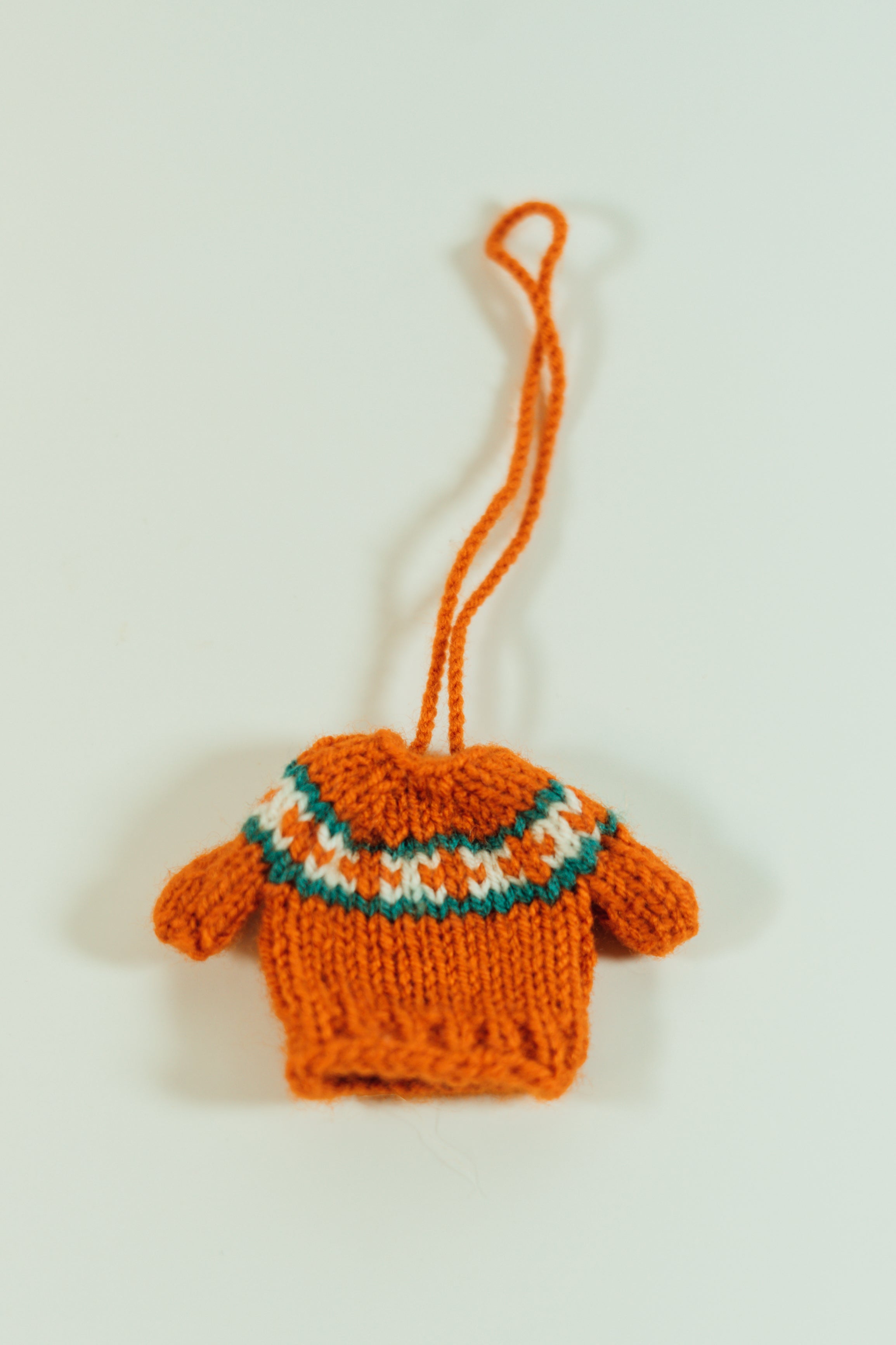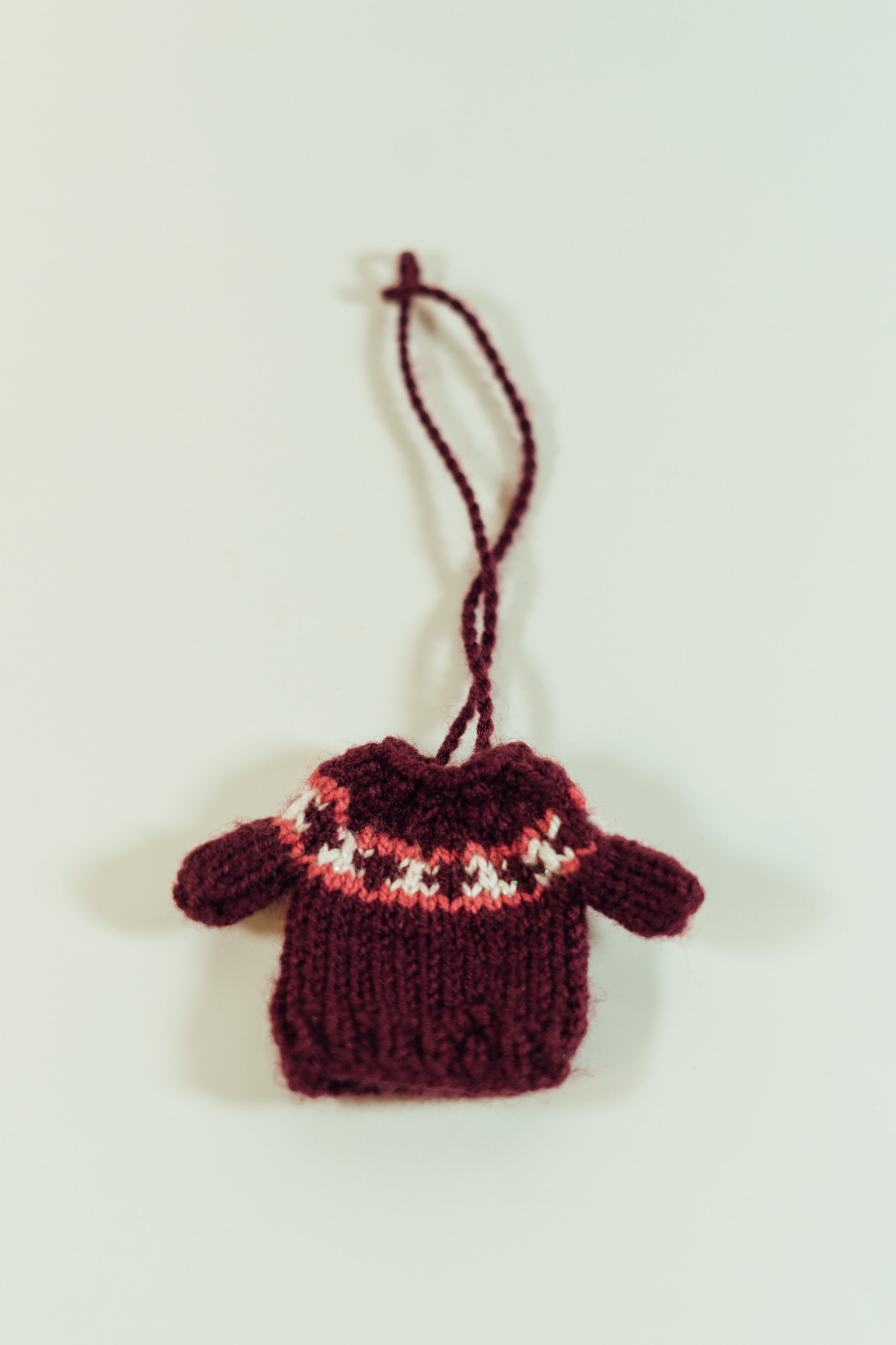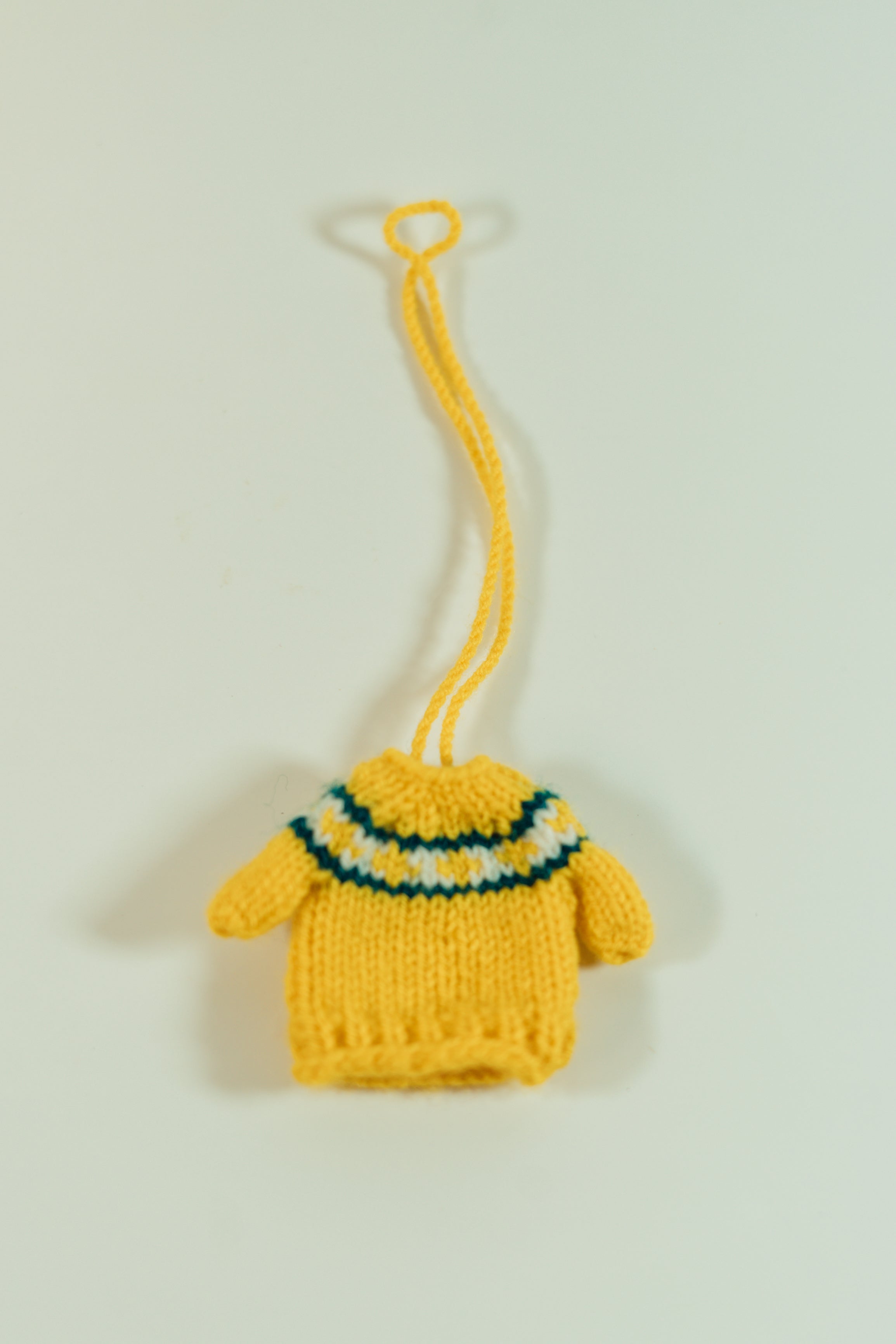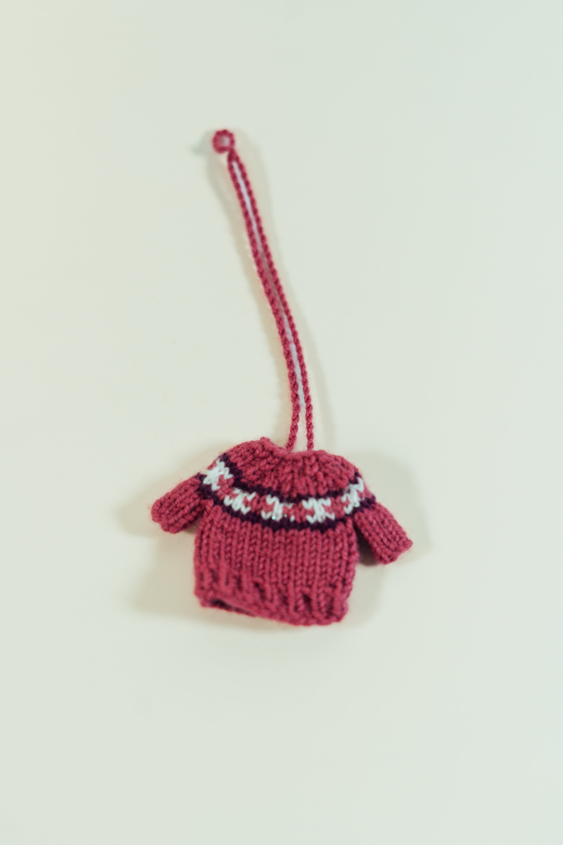 These adorable miniature sweaters are each uniquely hand knitted in the Middle East. They can be used as ornaments or to attach to just about anything you want to make cuter! Each one is slightly different in pattern and style. Body of sweater measures 5cm by 5cm and has an 11 cm hanging loop.