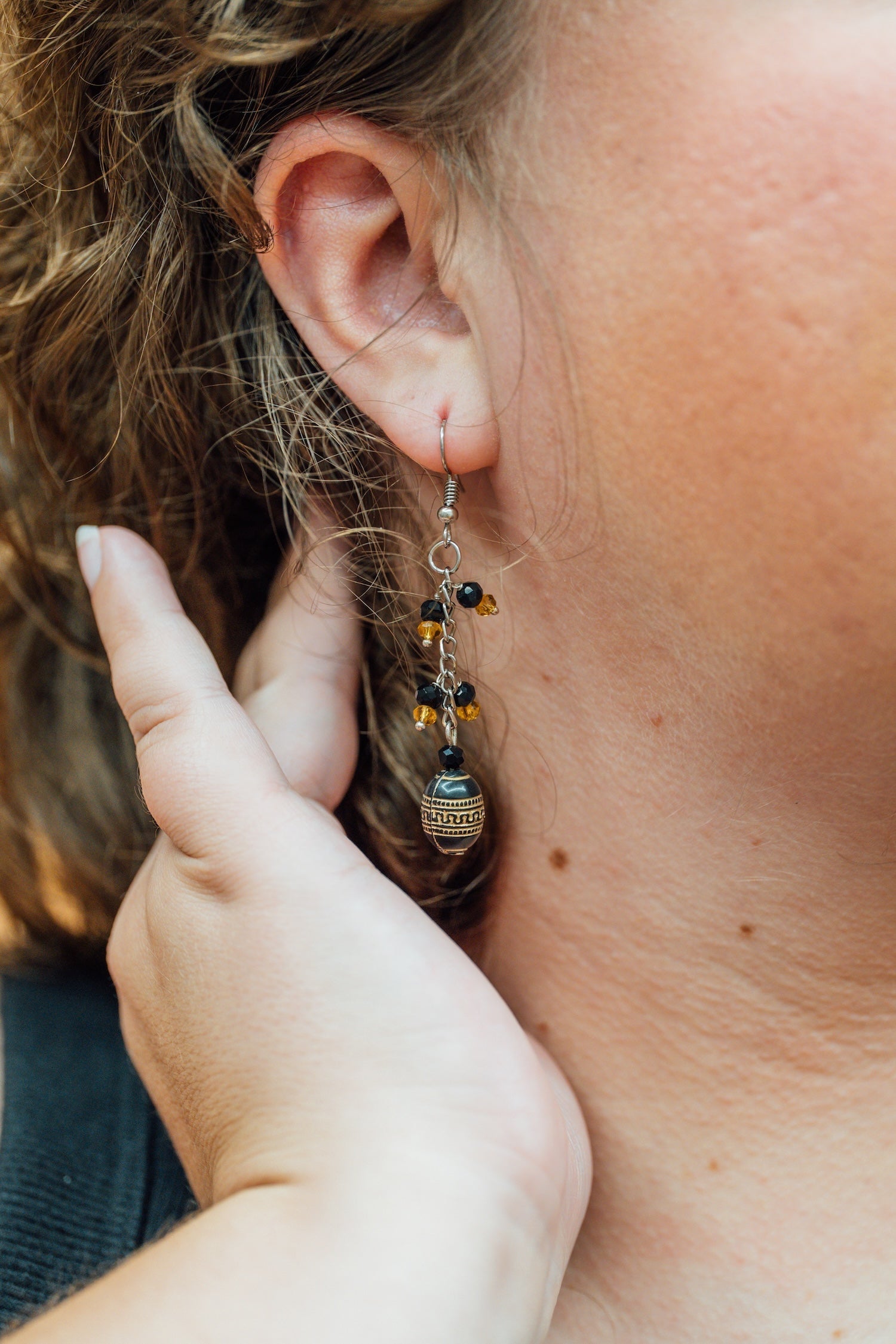 The Juvi Dangle Earrings are handcrafted beaded earrings made by artisans saved from at risk situations in Northeast India. Each pair features a unique combination of beads and chain dangles that add movement and style to your look. Because these earrings are handmade, colors and bead patterns vary making every pair one of a kind. Lightweight and expressive, they are perfect for everyday wear or special occasions while supporting fair trade work that empowers artisans through meaningful craftsmanship.