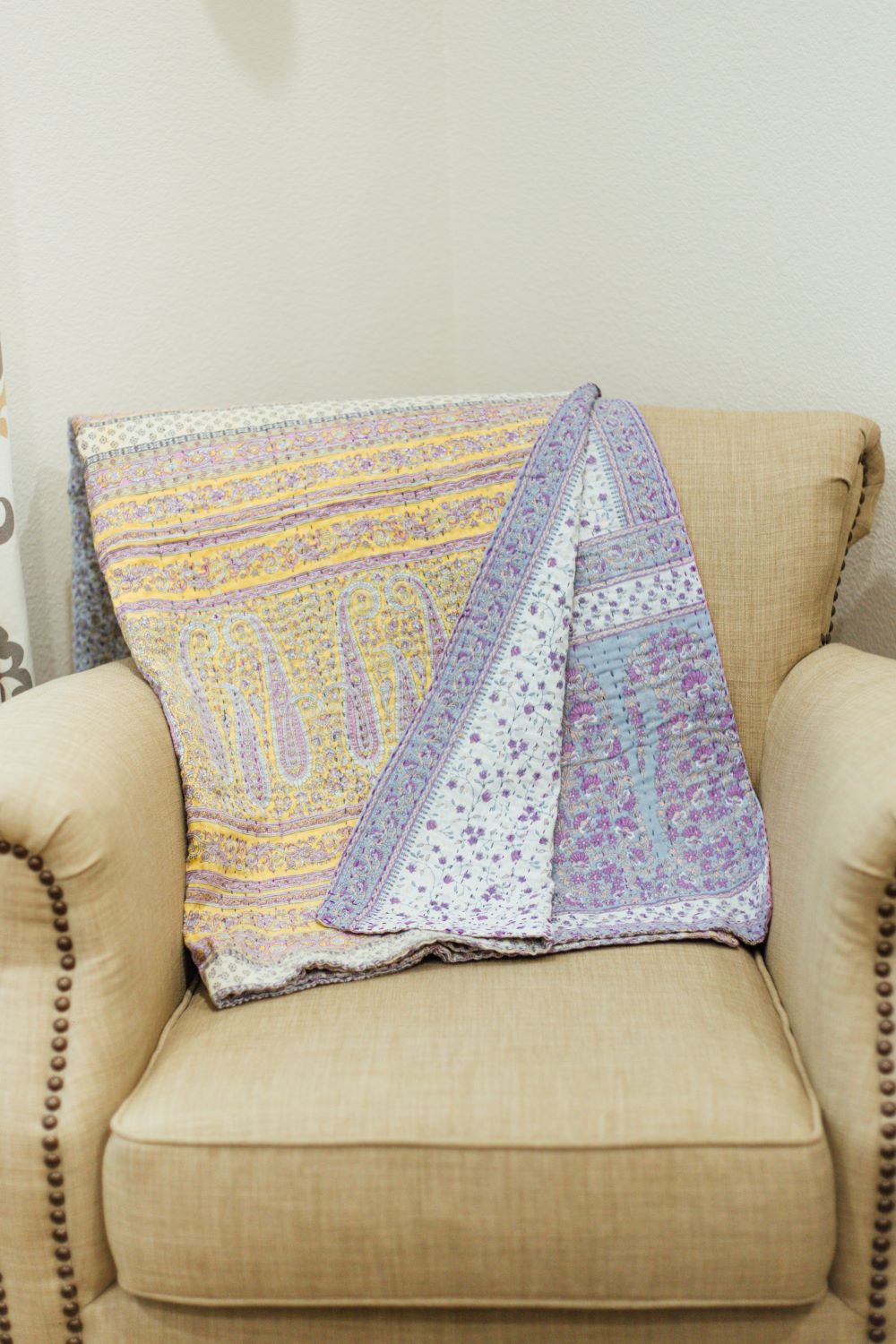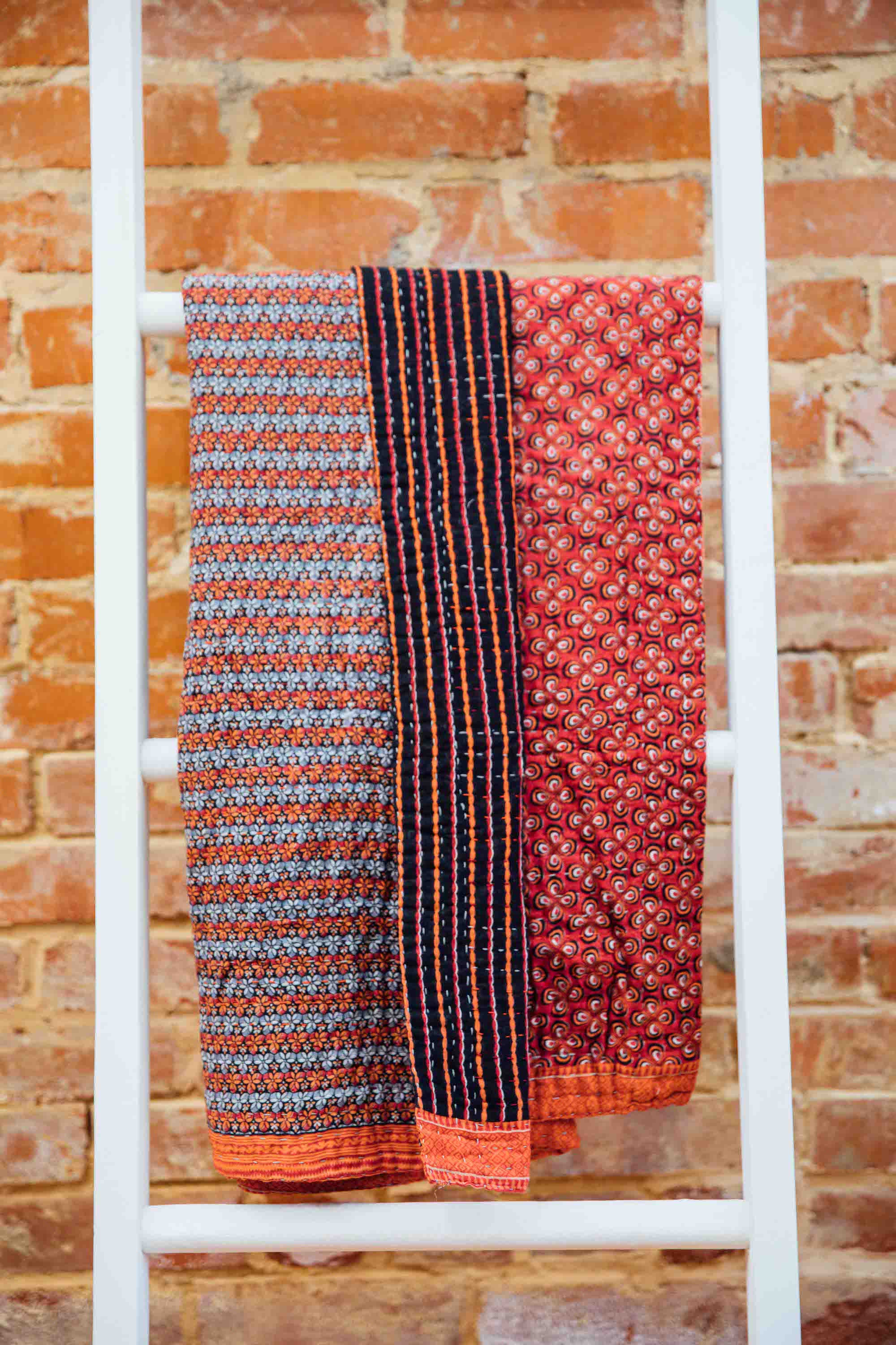 The Kantha Throw Blanket is a handcrafted quilted blanket made in India using layered cotton and traditional Kantha stitching that adds both texture and vibrant pattern to your home. Lightweight yet warm it is perfect for draping over sofas beds or outdoor seating and brings both comfort and artisanal character to any space. Because each blanket is handmade the stitches and fabric patterns vary slightly making every throw one of a kind. Made under fair trade conditions your purchase supports artisans with fair wages and meaningful work.