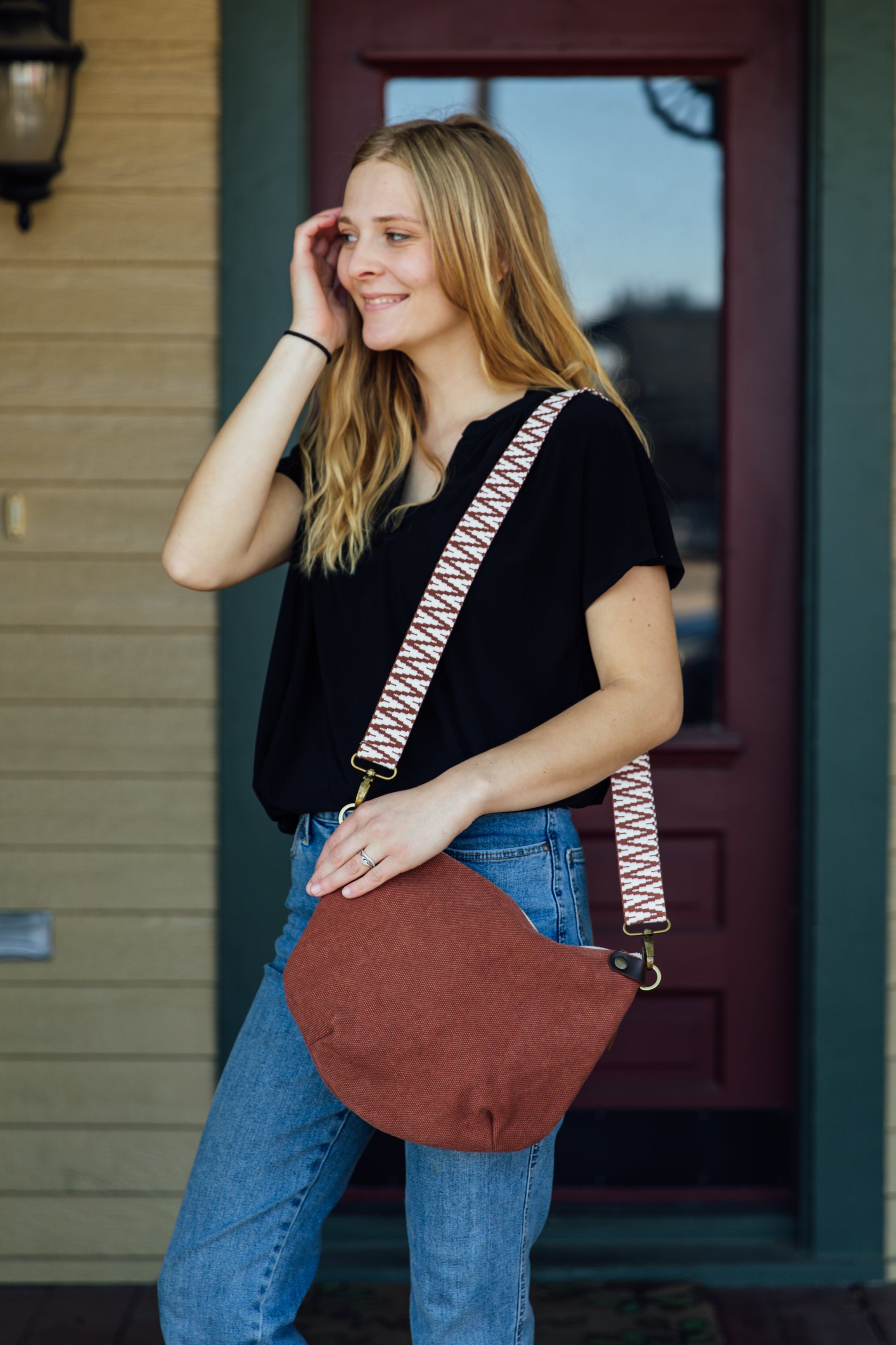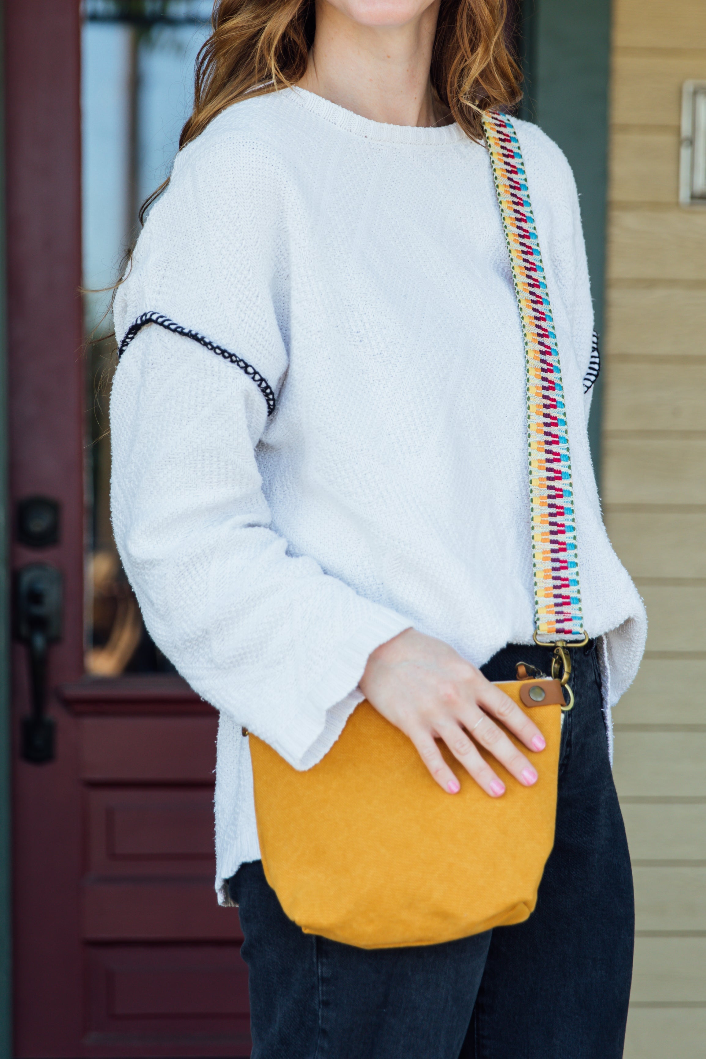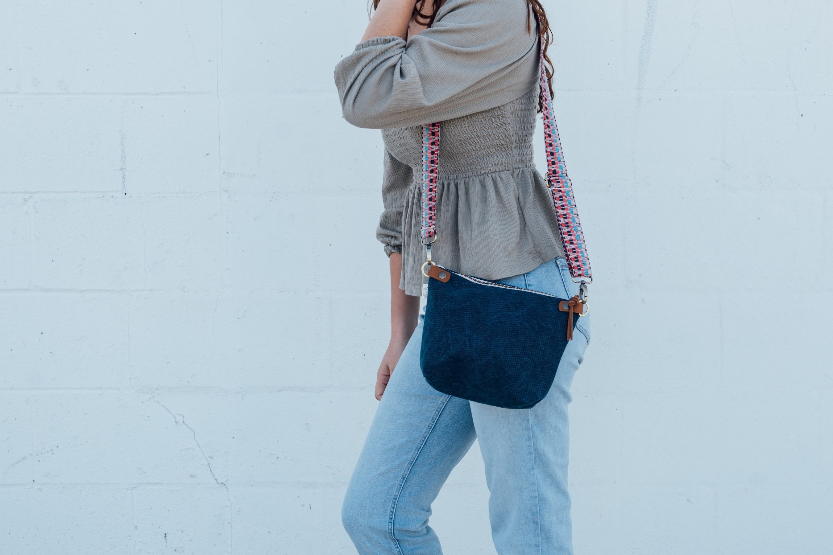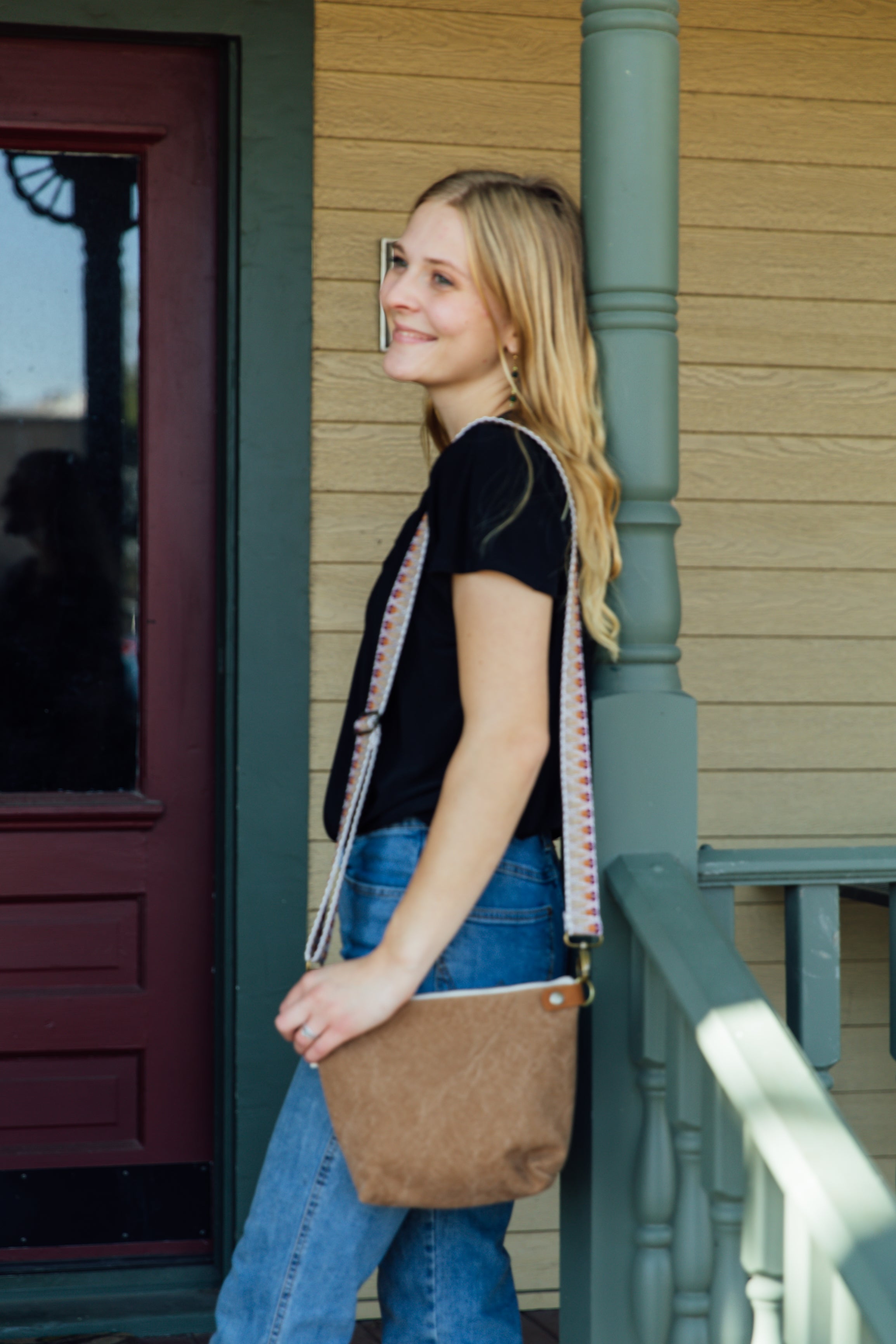 These sturdy canvas purses can be worn as a crossbody or shoulder bag. Each one has a vibrant woven adjustable strap. Interior zippered pocket, bronze hardware, and leather finishings. Handmade in Thailand.