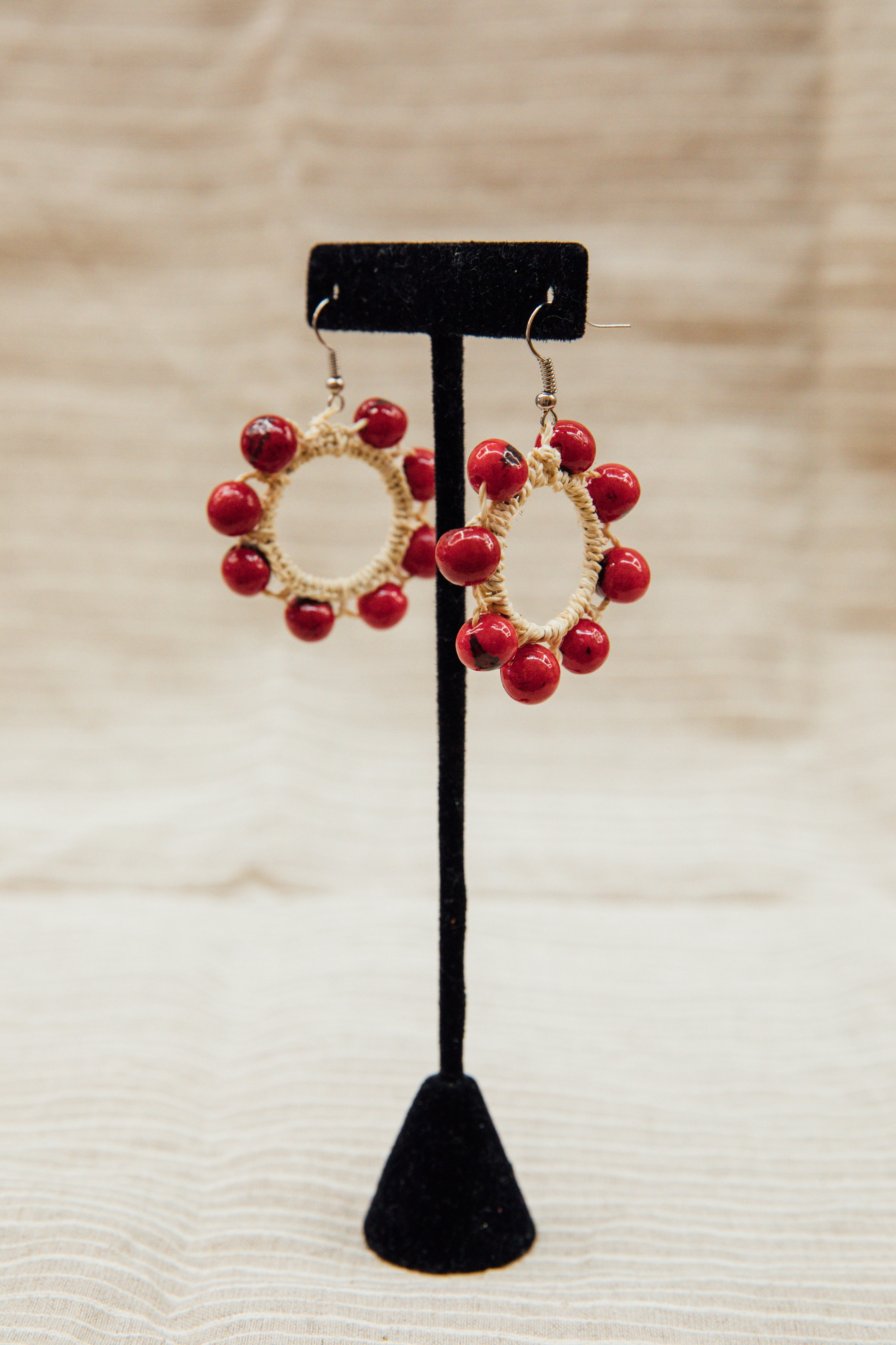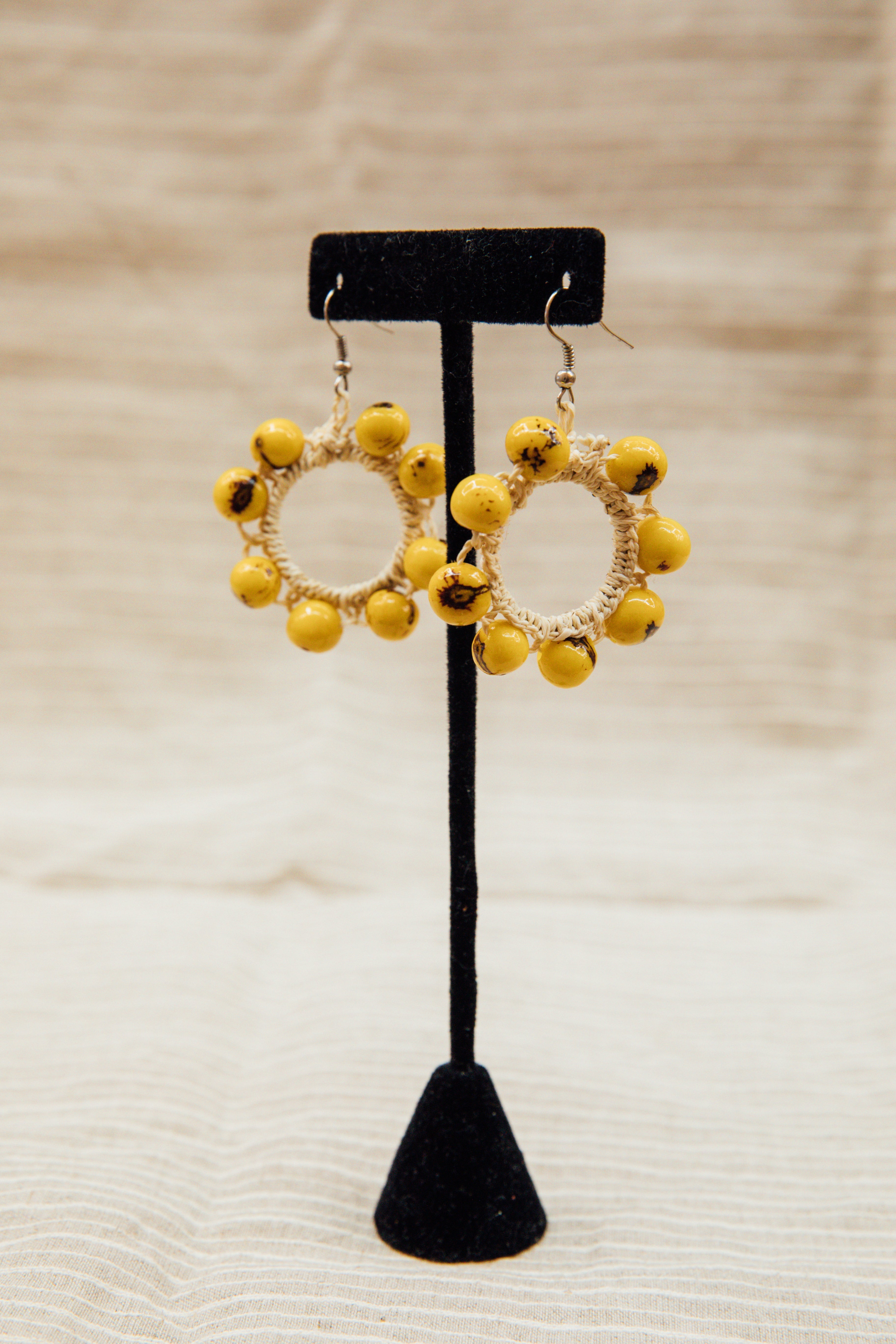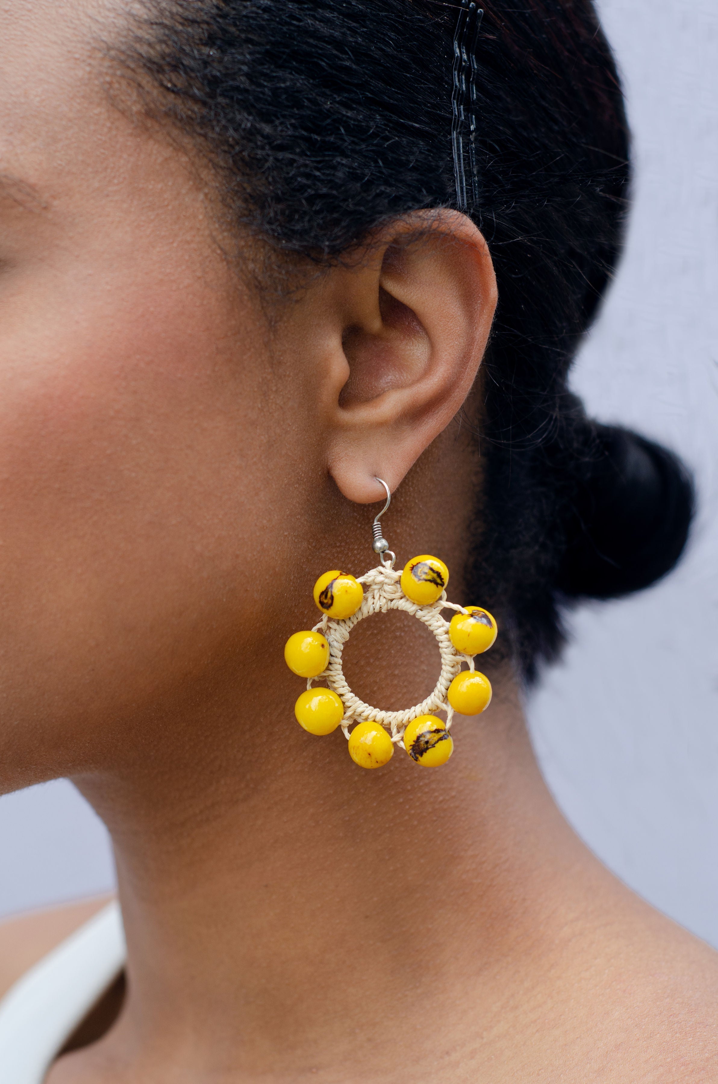 These beautiful earrings are handmade by our artisans in Colombia. The materials used to make them are locally sourced, including Colombian Acai berries and palm fibers. They are statement piece, great for bringing personality into your next outfit. They are 1.5" in diameter.